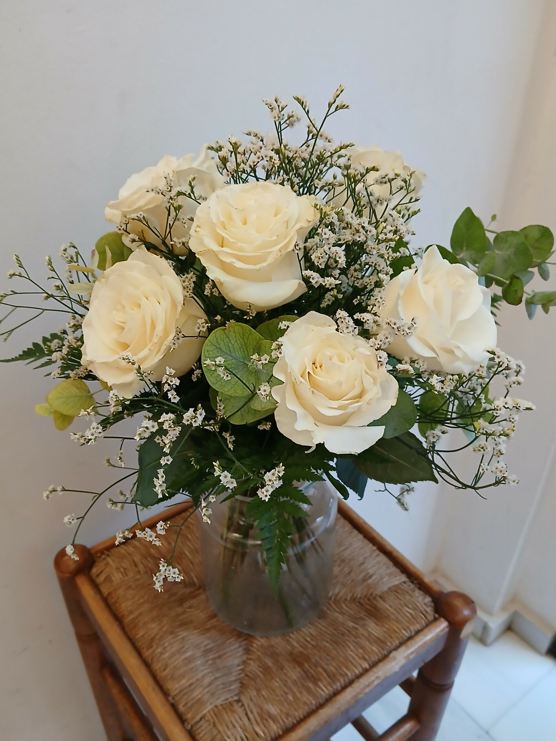 Dieser bezaubernde, elegante und schlichte Strauß aus sechs weißen Rosen von höchster Qualität wird den Empfänger begeistern.