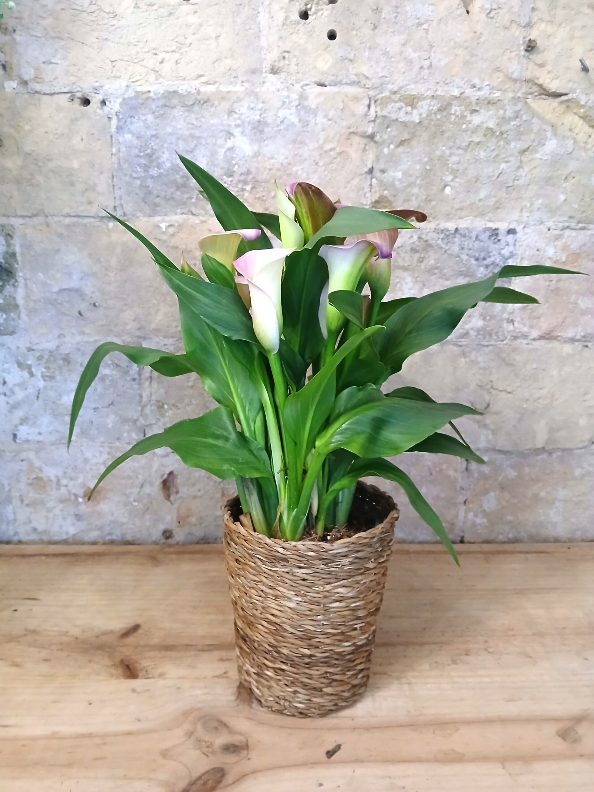 Esta preciosa planta natural de interior, de coloridas calas, viene presentada en una coqueta maceta cubre de mimbre.