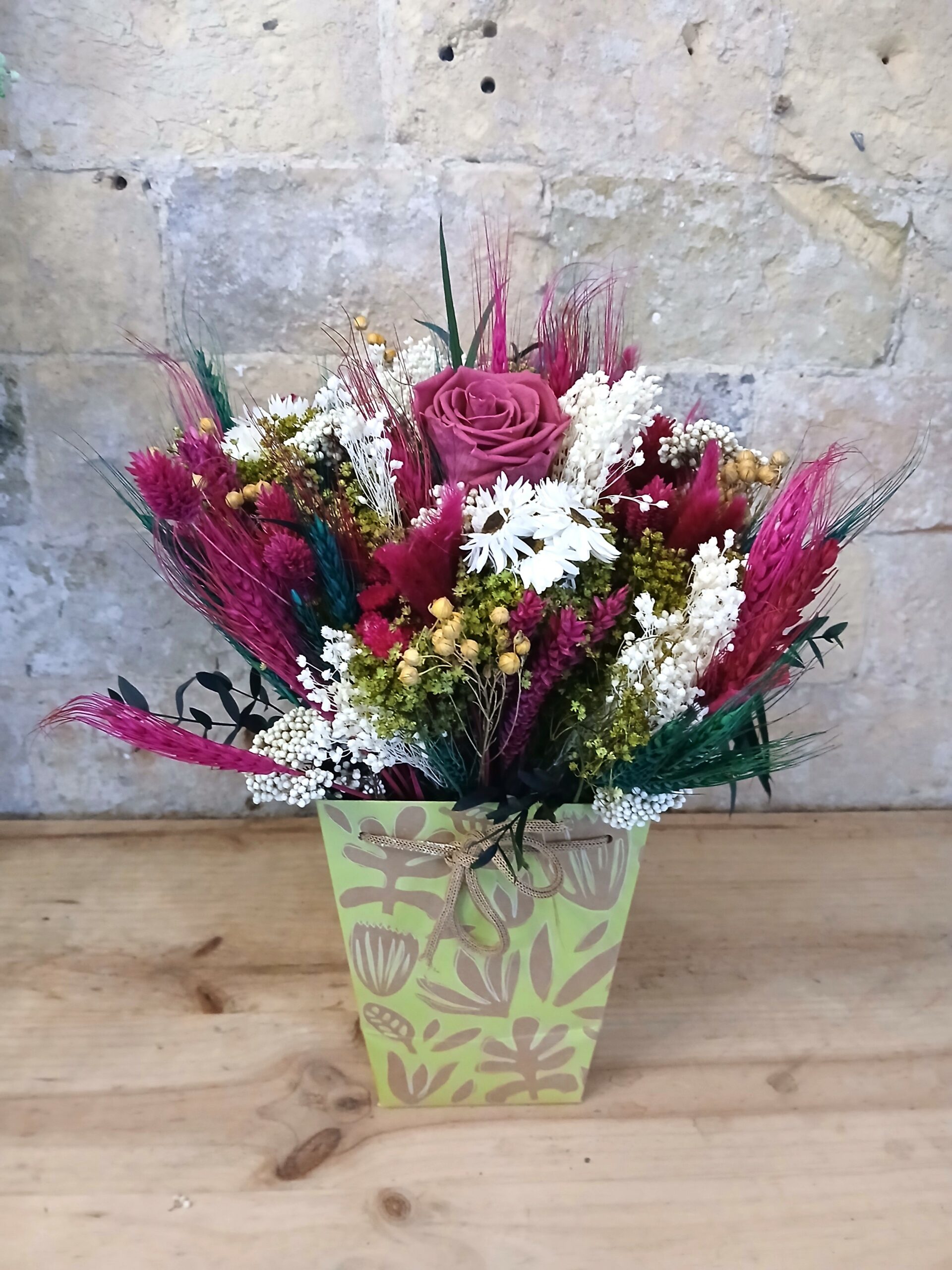 Este precioso centro de flores secas y preservadas cautivará tu mirada por su explosión de colores y alegría. No precisa agua y se mantendrá así de precioso por mucho tiempo. Se acompaña de un bolso de kraft de diseño exclusivo.