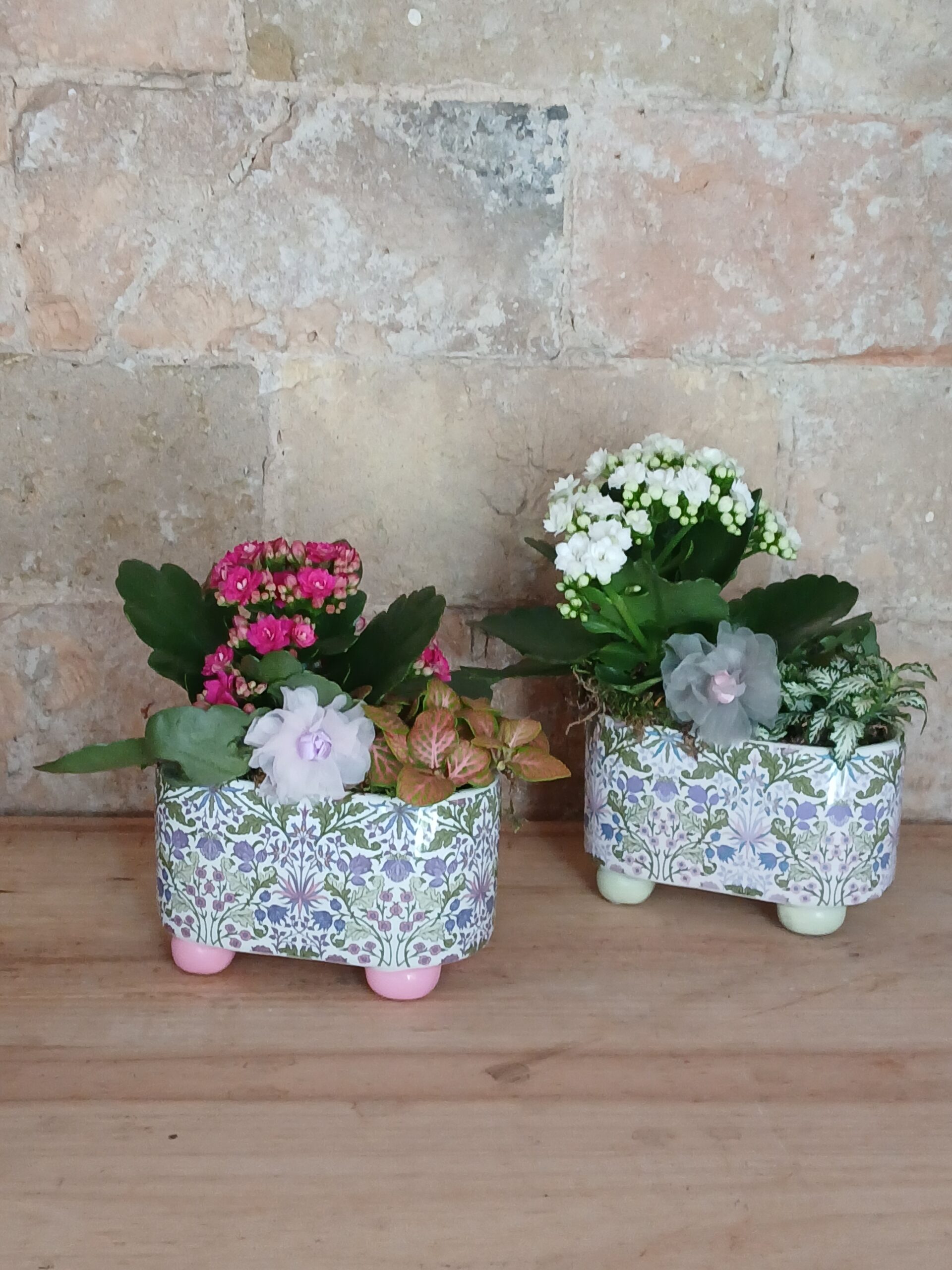 Esta preciosa mini jardinera, esconde dos pequeños tesoros en ella, un kalanchoe lleno de flores y una fitonia.