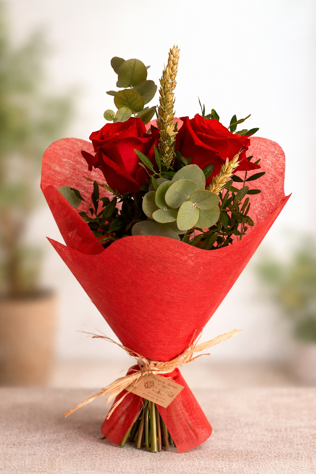 Este ramillete destaca por su sencillez elegante y su potente simbolismo. Dos rosas cuidadosamente seleccionadas representan amor compartido, equilibrio y complicidad.